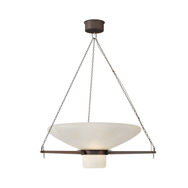 Virello LED Alabaster Single Pendant Light presents a sculptural interplay of alabaster and metalwork, refined into a striking suspended form that feels both architectural and serene. The design is centered around a broad hand carved alabaster bowl, each piece showcasing natural veining that diffuses light into a warm, atmospheric glow. The alabaster bowl hangs weightlessly from three slender chains that converge at a simple canopy, offering a clean visual line that balances softness and structure.