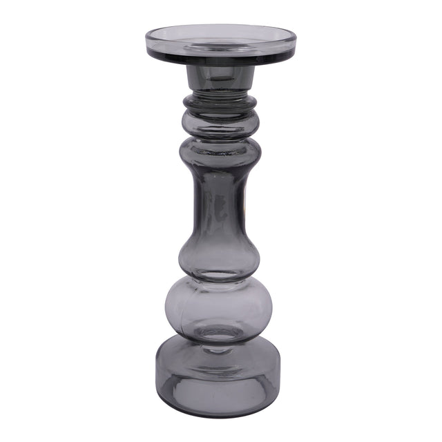 This candle holder marries modern grey glass with classic shapes, creating a captivating centrepiece. Its smoky grey hue transitions into clear glass, forming a mesmerising gradient effect.