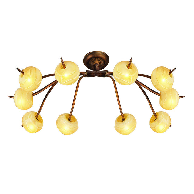 This expansive semi-flush ceiling light showcases a dramatic rustic gold frame paired with handcrafted amber frosted glass shades, creating a warm and expressive lighting feature for larger interiors. Its wide branching structure supports ten glass orbs that radiate a gentle amber glow, filling spacious rooms with inviting ambient lighting. The rustic metal finish introduces traditional charm, making the fixture well suited for heritage homes, classic living areas or warm toned dining rooms.