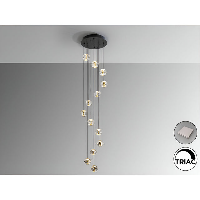 Zaria 13-light dimmable LED cluster pendant light showers interiors with crystalline brilliance, suspending thirteen sculpted acrylic spheres beneath a matte-black canopy. Each orb is faceted in clear, jewel-like facets and collar-tipped in satin gold, scattering the warm 3000K glow of the integrated 54.5W LEDs (3 853 lm) into sparkling reflections. Slim, field-cuttable suspension cables invite creative shaping - from a tight helix that fills double-height foyers to a loose waterfall above statement dining tables - while gravity toggles keep the canopy perfectly flush.