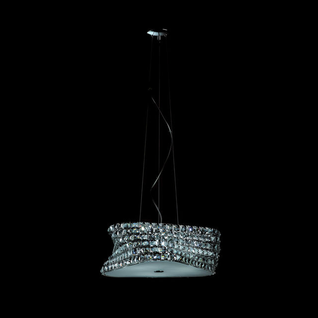 Suspended from slender wires, the polished frame maintains a clean, contemporary look while anchoring the textural weight of the crystals. The balance between metal and glass gives the design a refined yet decorative character, suited to modern homes that favour sharp lines with subtle glamour. This fixture delivers a blend of minimal form and high visual impact, making it a reliable choice for those seeking elegance with edge.