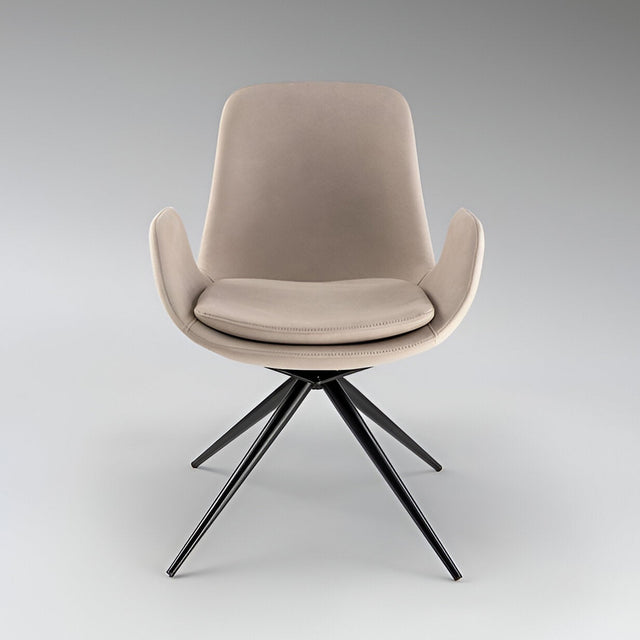 This swivel chair embodies quiet luxury, balancing ergonomic comfort with a soft, tactile aesthetic. The Zuna chair rests on a matte black metal base and features a smoothly contoured seat in a muted beige finish, upholstered in 100% polyester. The backrest is crafted from plywood, delivering firm support while maintaining a seamless silhouette.